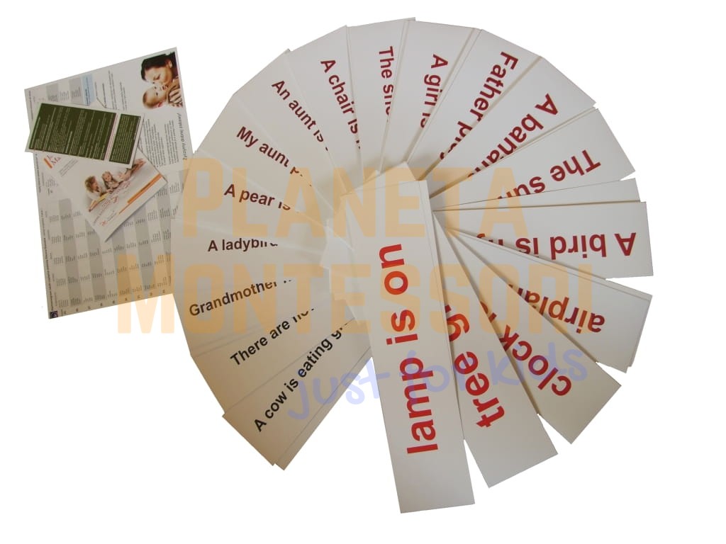 116 kart ze zdaniami przygotowującymi dziecko do czytania pierwszych książeczek (3 wyrazy, na kilku kartach pozostawiono miejsce na wpisanie imienia dziecka),
