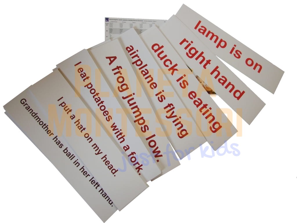 51 kart z prostymi zdaniami (3 wyrazy, na kilku kartach pozostawiono miejsce na wpisanie imienia dziecka),