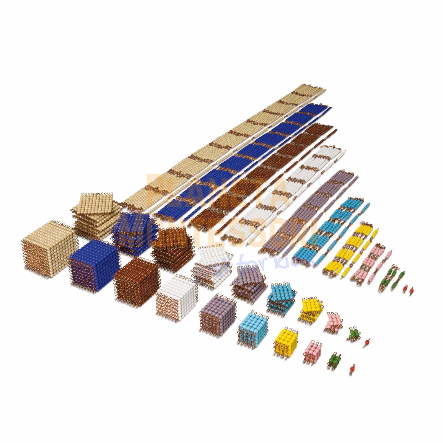 Ten obszerny zestaw materiałów perełkowych służy do nauczania ćwiczeń liniowych i zliczania skoków ilości kwadratów i sześcianów o numerach 1-10.