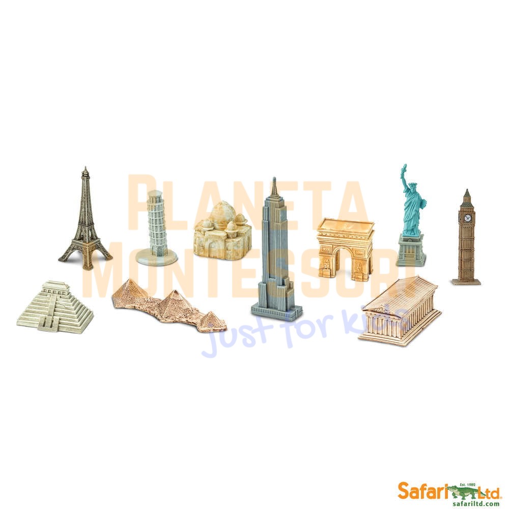 W zestawie jest 10 figurek - budowle z różnych zakątków globu.