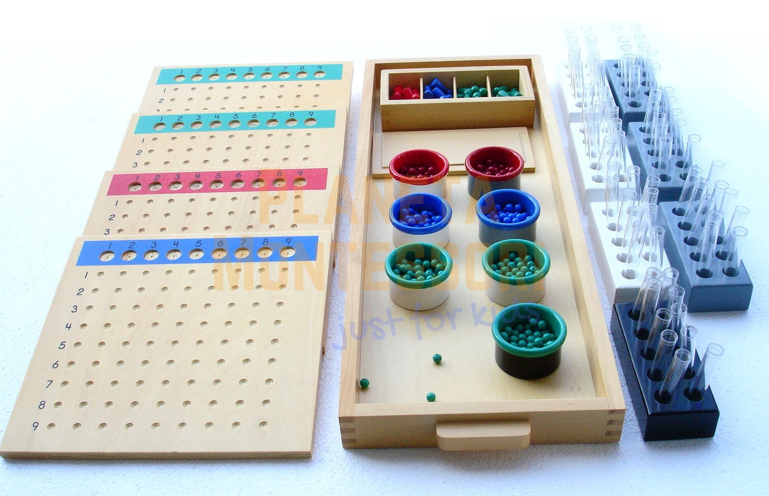 w misce przeznaczonej do tego celu liczone są cztery. 6 niebieskich koralików dziesięciu jest liczonych do kubka dziesiątek, dwie czerwone koraliki setki do kubka setki i cztery zielone koraliki po tysiącach (z szarego stojaka na tysiące) do kubka tysięcy.
