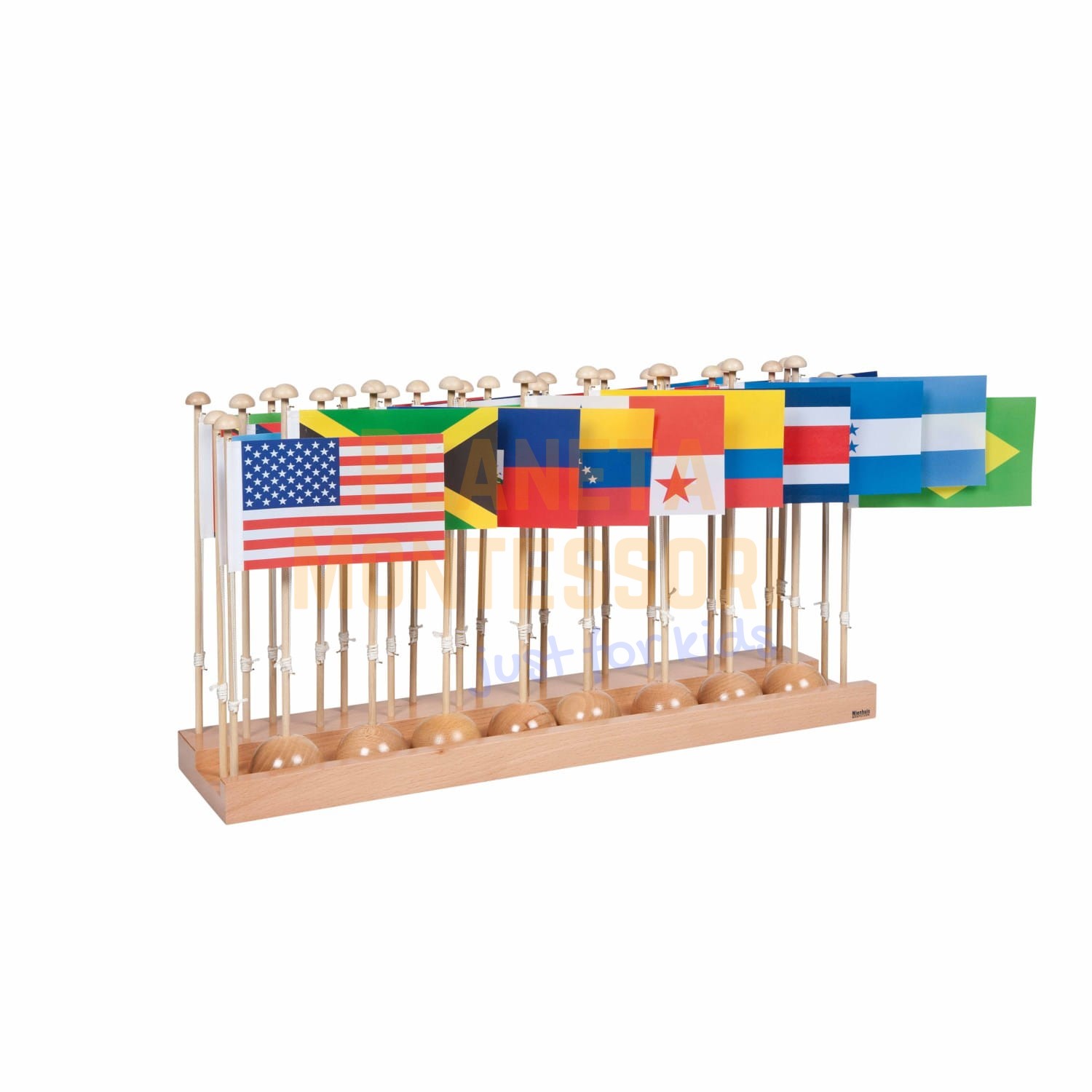 Drewniany stojak na flagę z flagami narodowymi każdego z krajów.