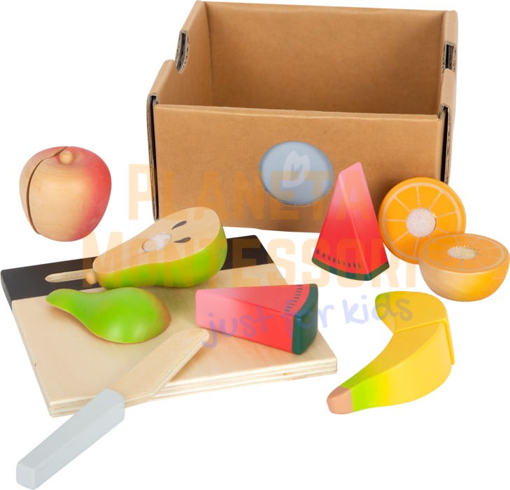 - Zabawkowy zestaw owoców do krojenia wykonany z wytrzymałego drewna o naturalnym wyglądzie i nadrukowanych detalach