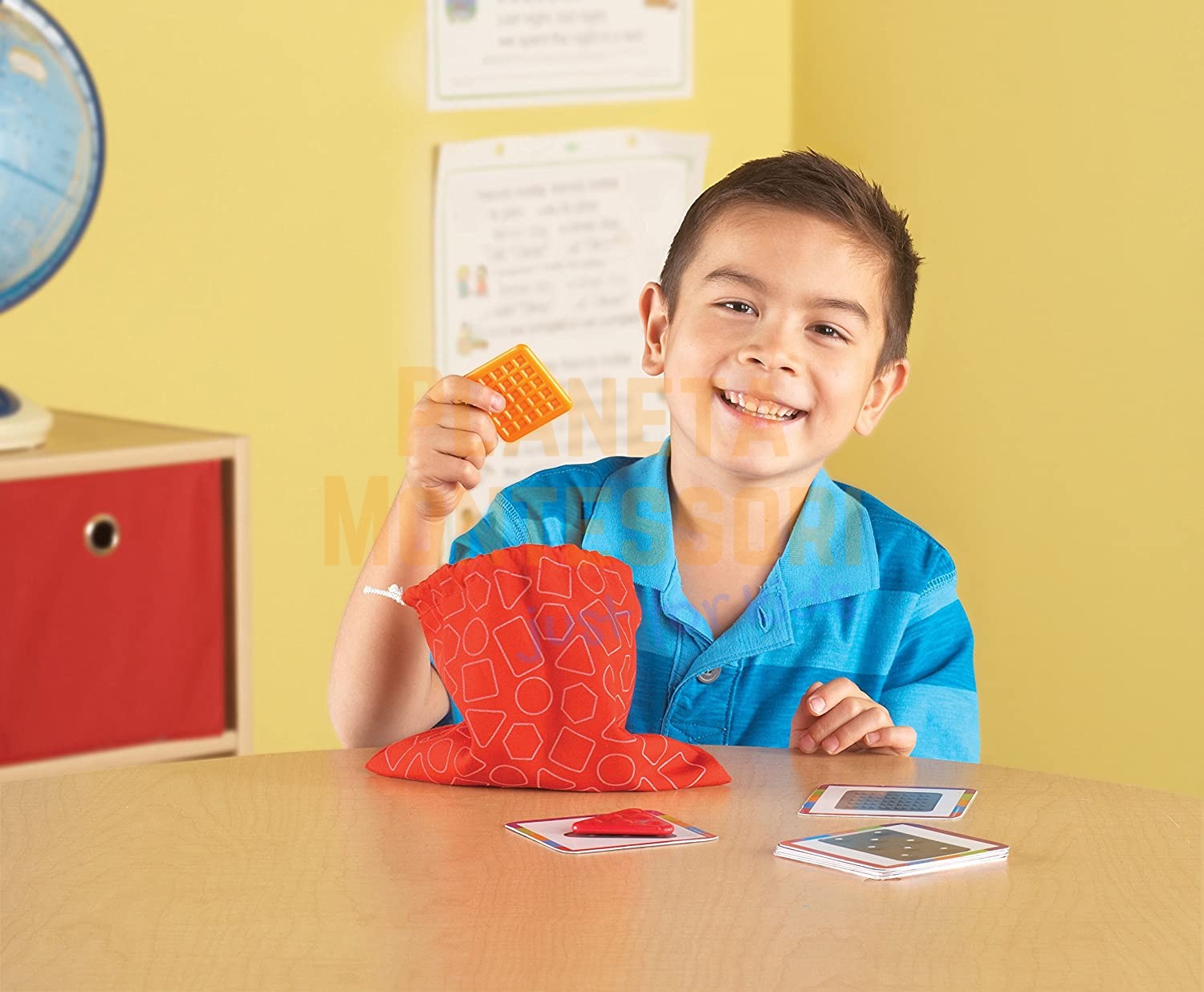 W zestawie 10 kart aktywności. Karty i elementy są trwałe i zmywalne. Kształty mierzą 5 cm.